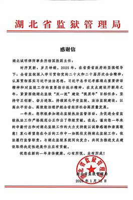 近日,湖北诚明律师事务所收到一封来自湖北省监狱管理局的感谢信,信中对本所杨国胜律师在2025年度参与全省监狱执法监督工作中的积极贡献,给予了高度肯定与诚挚感谢。